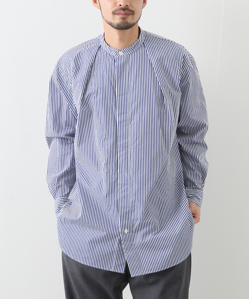 存在感ある高めの襟のスタンドカラーシャツは、ゆったりとしたシルエットをロング丈で仕立てました。 ボディにはアイコニックな深めのインプリーツを入れることで身頃のボリュームを出し、裾は前後差をつけて長めのスリットを入れることで後ろ姿まで綺麗に見えるように仕上げています。また、袖の剣ボロ部分を長く設定しアジャスタブルボタンを2つ設けているので、袖をまくる際に2段階で留めることができます。メーカー品番:CSH-1/BLUE STRIPE【:colon / コロン】2022SSシーズンデビューとなる新鋭ブランド ":colon / コロン"ドレスクロージングに造詣の深いチームが手掛けるは、トレンドのリラックスシルエットは意識しつつも、あくまで大人が上品に着られる洋服。シャツは熊本、パンツは秋田のドレス工場で生産し、パターンメイキングによって肩やウエストで着たり、穿いたりすることでシルエットの妙を楽しんで頂けます。【ご注意】※照明の関係により、実際よりも色味が違って見える場合があります。またパソコン・スマートフォンなどの環境により、若干製品と画像のカラーが異なる場合もございます。※商品の色味は、商品アップ画像をご参照ください。モデルサイズ:身長:179cm 着用サイズ:3本体:洗濯機洗い(弱)