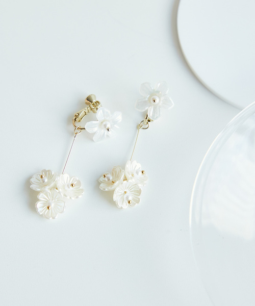 大人なスウィングデザインで、すっきりヘアにベストマッチ!【デザイン・シルエット】・シェル風素材で模ったフラワーパーツのイヤリング。・パーツに垂らしたメタルバーの先端には、小粒のビーズをボリューミーにオン。【カラー】・アイボリーのみの展開。【スタイリングポイント】・ショートヘアやボブヘア、まとめ髪にアクセントで添えて。・きれいめなパーティースタイルに合わせるのもグッド。※撮影時の光、お使いのモニター環境によって色の見え方が違う場合がございます。
