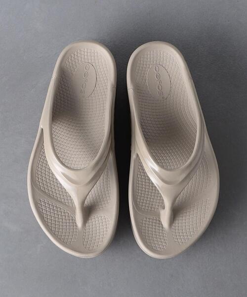 スタイルアップに効果的な厚底デザインのトングサンダル■デザイン厚みのあるソールデザインながらも履き心地の良さはそのままに。これからの季節に重宝するアイテムです。■コーディネートアクティブなシーンにはもちろん、リラックスしたリゾートスタイルにもぴったり。長時間の外出時にも活躍してくれる一品です。■メーカー品番BLACK:2000440050211<OOFOS (ウーフォス) >足裏への衝撃が大きいシューズは世の中に溢れているが、衝撃を吸収しリカバリーを目的とするシューズがないことに気付いた彼らは、OOFOS を作りリカバリーシューズのパイオニアとなりました。 製品に使われている特殊素材 OOfoam は、前進力を生む事を目的とした一般的な EVA 素材のミッドソールと異なり、衝撃の反発を 37% 抑えることができ着地による足裏への衝撃を軽減することができます。そのため膝、腰、背中にかかる負担を軽減でき、また人間工学に基づいて設計されたフットベットにより、足を優しく包み込み、土踏まずをしっかりサポートします。【注意事項】・素材の特性上、プリント部分にインクのひび割れが発生する場合がございます。・左右の大きさの違い、足入れの広さ、同じサイズ、同じ製造工場であっても個体差が生じる場合がございます。・靴底に若干の突起もしくはへこみが見られる場合がございますが、製造工程上発生するもので不良品ではございません。・生産ロットによりロゴプリントの仕様やロゴの位置が異なる場合がございます。※商品を使用前に、タグ等に記載されている「取り扱い上の注意書き」、「洗濯表示」を必ずご確認ください。※商品画像は、光の当たり具合やパソコンなどの閲覧環境により、実際の色味と異なって見える場合がございます。あらかじめご了承ください。※商品の色味の目安は、商品単体の画像をご参照ください。※シューズの重量は、シューズ本体のみ両足の重量となります。箱や付属品は計測に含まれません。※商品に不良が無い場合、包装紙および箱の破損がございましても発送いたします。あらかじめご了承ください。店舗へお問い合わせの際は、全国のUNITED ARROWS各店舗まで下記の品名/品番をお申し付けください。品名:OOFOS OOmega 品番:17314998507