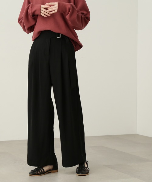 デイリースタイルに取り入れやすいベルト付ワイドパンツ。スクエアバック付きの共布ベルトを絞れば、ウエストラインをすっきり見せてくれるデザインです。 共布ベルトは脇から縫い付けているので、着崩れる心配なく、ベルト先はサイドに垂らして着用できます。 ウエストの後ろはゴム入りでフィットし、トップスインもアウトもスッキリ決まり、 Tシャツ合わせで大人カジュアルにも、短丈トップスやブラウス合わせでフェミニンな印象にも着まわしできます。 ********************** 透け感:なし 裏地:なし 伸縮性:ややあり 光沢感:なし 生地の厚さ:薄手 **********************