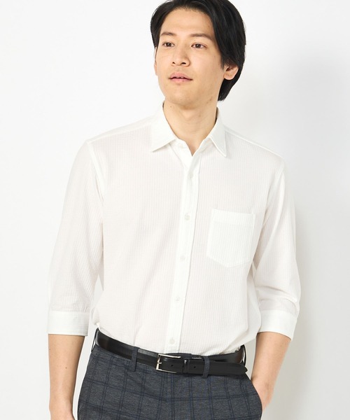UVカット機能も搭載した快適な素材「HIGH COOL(ハイクール)」使用。 ブランド定番のサッカージャージ7分袖シャツです。 【デザイン・素材】 吸水速乾、UVカット機能、ストレッチ性のある「HIGH COOL(ハイクール)」という素材を使用。 夏の暑い時期いも快適に過ごせるシャツ。 ストレスフリーな伸縮性のあるジャージ生地を使い、サッカー地に仕立てました。 サッカー地特有の生地の凹凸感が、肌への接地面を少なくしサラサラとした肌触りをキープ。 柔らかな生地感も相まって、とても着心地の良いシャツに。 ストライプ柄が爽やかな印象。 サッカー地の凹凸によって、ありきたりになりすぎない、さりげないおしゃれを演出。 襟元は綺麗に開くようパターンメイキングしたワンピースカラーを採用しています。 【カラー】 ナチュラルで着回ししやすい「ホワイト」 落ち着きと爽やかさを演出できる「ネイビー」 オフィスに馴染み、シックな印象の「ダークネイビー」 【着用シーン】 春夏のオフィススタイルにマッチ。七分丈ですので、クールビズにも最適です。 ブルーやネイビーのジャケパンや、ホワイトアイテムとあわせることでより爽やかな雰囲気に。 もちろん休日のお出かけコーディネートにも。 その他にも、同窓会・成人式・会食(食事会)・お祝い・パーティー・披露宴・二次会といった華やかな場や、 授業参観・演奏会など多少フォーマルな場にもご着用いただけます。 シルエットにこだわったデザインはノージャケットでもすっきりと洗練されたスタイリングを叶えます。 【着用モデル情報】 身長185cmバスト94cm ウエスト78cm ヒップ98cm 着用サイズ:03(L) 【CROWDED CLOSET(クラウデッド クローゼット)】 MEN'S BIGIのスーツレーベル。 確かなもの作りを基本に、ファッション性と機能性を備えた高品質なスーツスタイルを手ごろな価格で。 変わりゆくライフスタイルに合わせてテーラリングされたビジカジウェアをご提供いたします。 ※サンプルでの撮影の為、実際の商品とデザインが多少異なる場合がございます。 ※生地や仕様・デザインにより、着用感が異なる場合がございます。 ※モニター・パソコン環境により色味に誤差が生じる場合がございます。予めご了承くださいませ。