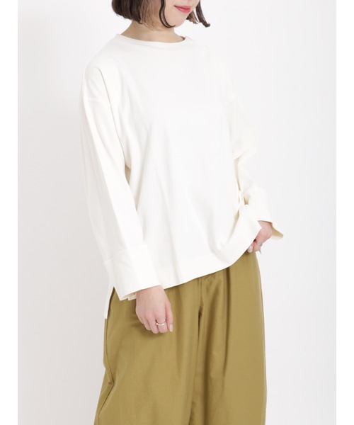 なめらかで上質な肌触りのスムース素材を使ったコットン100%のプルオーバー。 袖がゆったりとしているのでこなれ感のある大人っぽいバランスになっています。 肩のボタンがマリンテイストな雰囲気を醸し出します。 ※商品画像は、撮影環境やお客様のご利用のPC・スマートフォンのモニター環境などにより実物と色味に差異がある場合がございます。 【その他採寸】 F 着丈:[前]62cm[後]66cm