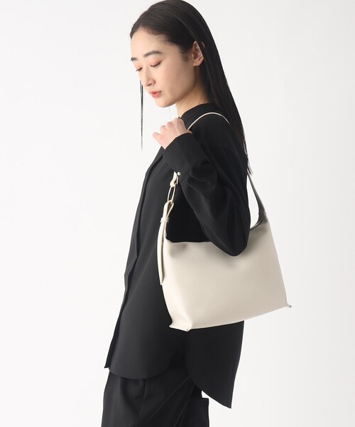 大き目なメタルリングが特徴的なワンハンドルバッグ。 【デザイン】 使いやすいサイズのワンハンドルバッグ。 シンプルなディティールなので通勤スタイルはもちろんOFFシーンでも活躍しそう。 ファスナー開閉で防犯面も安心です。 メタルリングの部分でサイズ調整をしていただけます。 ※ポケット数:内側×1 【素材】 マットな表面感のフェイクレザーを使用して、内側をスウェード調の生地を貼り合わせて張りを出しています。 店舗へのお問い合わせ商品番号:C71-16039 ●製品寸法: 00:高さ19.5cm 幅(上部)24cm 幅(下部)23.5cm マチ14.5cm ショルダー対応サイズ61~69cm 備考:重量:約370g