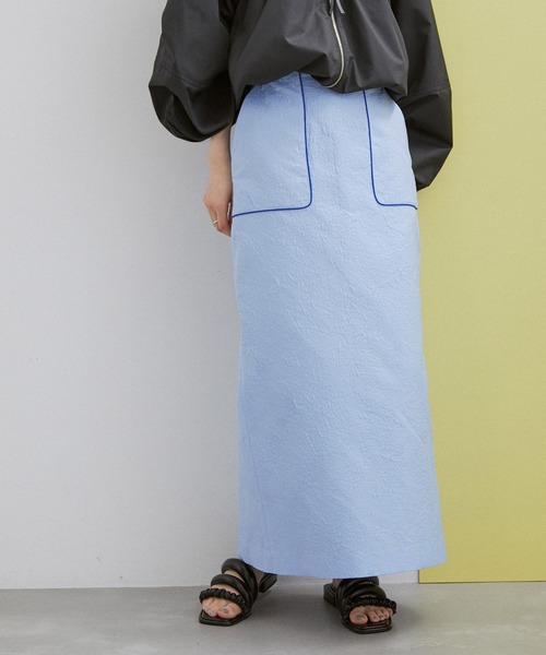 《洗える》女っぽさが引き出されるリーンシルエット。パイピングデザインがキャッチーなジャカード素材のロングタイトスカート◇2023春夏◇ADAM ET ROPE' FEMME【Material】張り感と凹凸感のある、しっかりとした生地感のジャカード(ジャガード)素材。【Design】オンスタイルにもオフスタイルにも合わせやすい、すっきりシルエットのハイウエストマキシスカート。ポケットからウエストベルトにかけて施した、配色のパイピングがデザインポイント。センターバックには深めのベントを入れているので足さばきが良く、抜け感も演出してくれるデザイン。裏地付きなので、透けを気にせず着用できるのも嬉しいポイント。【Color】大人っぽいブラック(ブラック×ベージュパイピング)、フェミニンなオフホワイト(オフホワイト×ホワイトパイピング)、モードなサックス(サックス×ブルーパイピング)の計3色展開。【Styling point】オンスタイルなら、シャツ+ヒールを合わせれば、オフィススタイルの完成。デザイン性のあるシャツをあわせて、モードなスタイルもおすすめ。オフスタイルなら、Tシャツやスウェットでカジュアルダウンしたスタイリングをぜひ。---------------裏地:あり光沢感:なし透け感:なしウエスト:ゴムなしポケット:あり伸縮性:なし生地の厚さ:やや厚手洗濯方法:洗濯機可その他仕様:バックファスナー---------------◇モデル情報身長:165cm size:36