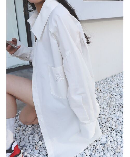 ■デザイン 胸元にオリジナルロゴを施したベーシックなシャツです。 オーバーサイズですが、程よくハリ感のある生地で上品な印象に。 柔らかな色合いのカラバリも魅力です。 ■スタイリング キャミソールやタンクトップの羽織りとしてはもちろん、 一枚でワンピース風に着るのもおすすめ。 -------------- 透け感:ややあり 裏地:なし 生地の厚み:普通 伸縮性:なし -------------- オリジナルロゴを左胸に施したオーバーサイズシャツ。 ハリ感のある生地で、メンズライクに着用できます。 カラーリングが春夏らしく爽やかな印象になります。