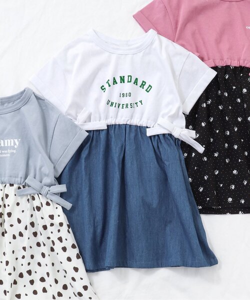3色それぞれ雰囲気の異なるドッキングワンピース。オフホワイトはライトオンスデニム/ピンクは大人っぽいモノトーンの花柄/サックスはダルメシアン柄のスカートをそれぞれ組み合わせたカジュアルライクなワンピース☆ 丈はひざ丈となっております。 トレンドのクロップドトップスとのコーディネートが一枚で完成します♪ 【 apres les cours -アプレレクール- 】 「キオク いろどる、こどもふく。」 大切なキオクを彩る、お気に入りの一枚。 「アプレ レ クール」は独自の色づかいやテキスタイルで日々をトクベツに過ごせる そんな「一枚」をお届けします。