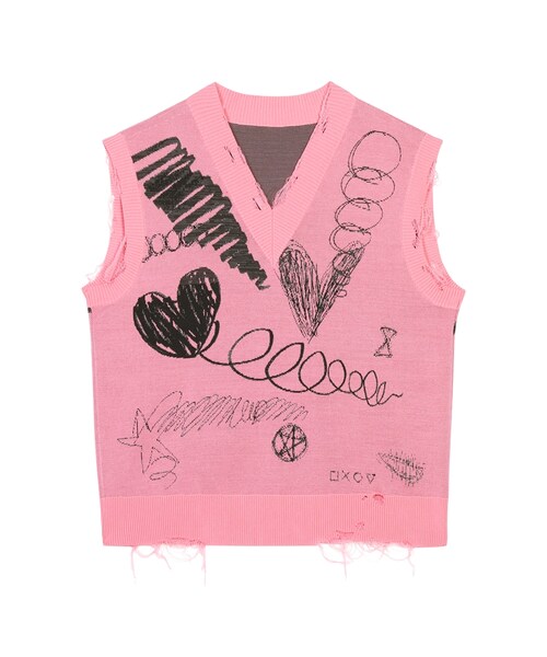 【DESCRIPTION】 春に欠かせないニットベストは、温度調節にも優れたアイテム。 ハートの落書き柄のベストは、どちらの色も大人ガーリー満載でおすすめ。 【MATERIAL】 CLOUD WHITE 綿57% ポリエステル33% ナイロン6% ウール4% PINK 綿50% ポリエステル50%