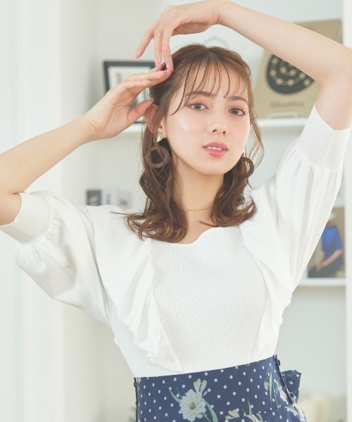 スウィートで華やかな印象を引き立てるラッフルニットプルオーバー 【Design】 ・ボディにフィットするリブとラッフルが目を惹くニットプルオーバー。 ・ショルダー部分に大きなラッフルをあしらうことで顔周りを華やかに演出します。 ・またラッフルが肩回りを覆うことで気になる二の腕もカバー。 ・スクエアネックがデコルテラインをスッキリと見せ女性らしさを引き立てます。 ・春のお出かけコーデにピッタリなアイテムです。 【Fabic】 ・シャリ感のあるさらっとした収縮性のある混紡生地を使用。 ・ご自宅でお手入れが出来るのも嬉しいポイント♪ ・春のコーデに取り入れやすいホワイト、サックス、ブラックの3色展開となります。 【Care】 洗濯機洗い可能 M:(02):着丈57㎝/身幅32㎝/肩幅28㎝/袖丈39㎝/袖巾22㎝/袖口巾9㎝/裾回り33㎝