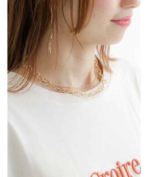 デザインの異なるチェーンが組み合わされ、重ね付けしたようなルックスを楽しめるネックレス。 留め具部分はアジャスター付きなので、お好みのサイズに調整することができます。 クルーネックのトップスと合わせたスタイリングがおすすめ◎ いつものコーデにプラスすれば、きれいめな雰囲気を演出するアイテムです。 ※商品画像は、撮影環境やお客様のご利用のPC・スマートフォンのモニター環境などにより実物と色味に差異がある場合がございます。 【その他採寸】 F 全長:35-38cm(アジャスター5.5cm