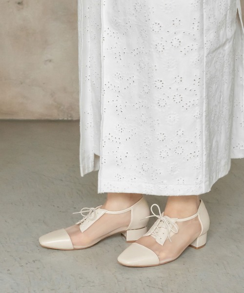 ◆2023SS新商品◆涼し気なシースルー素材のレースアップシューズPOINT・女性らしいスッキリとしたスクエアトゥ・程よく抜け感のあるシースルー素材・安定感のあるチャンキーヒール・程よいアクセントのゴールドピース機能性・返りが良い 屈曲性が良く歩きやすいスタッフの着用コメント-----------------------------スタッフK [普段のサイズ:Sサイズ/22.5cm]足長:22.5cm / 足幅:やや広め(2E) / 甲高:普通【試着サイズ】Sサイズ/素足で着用【サイズ感】Sサイズをぴったり履きます。【着用コメント】シースルー素材で爽やかです。-----------------------------スタッフR [普段のサイズ:Mサイズ/23.5cm]足長:23.5cm / 足幅:普通(E) / 甲:普通【試着サイズ】Mサイズ/素足で着用【サイズ感】Mサイズをぴったり履きます。【着用コメント】ゴールドピースがコーデのアクセントになり可愛いです。-----------------------------スタッフY [普段のサイズ:Lサイズ/24cm]足長:24cm / 足幅:普通(E) / 甲:普通【試着サイズ】Lサイズ/素足で着用【サイズ感】Lサイズをぴったり履きます。【着用コメント】紐で調整ができます。-----------------------------スタッフH [普段のサイズ:LLサイズ/25.5cm]足長:25.5cm / 足幅:狭め(D) / 甲:高め【試着サイズ】LLサイズ/素足で着用【サイズ感】LLサイズをぴったり履きます。【着用コメント】落ち着いた色味で大人っぽく履けそうです。-----------------------------注意事項お使いのモニタにより、商品の色味が多少異なる場合がございます。ご了承ください。