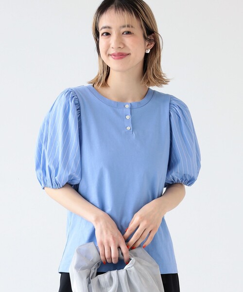 カジュアルにもキレイめにも■デザイン袖部分に布帛のストライプ生地を使用した異素材切り替えのTシャツ。袖山と袖口にギャザーを入れ膨らみを出しパフスリーブで可愛らしく仕上げました。同型の色違い(品番:6104-0224-101)もございます。■コーディネートお袖のボリュームがポイントなので、ボトムスにインしたスタイリングはメリハリが出てさらに素敵に仕上がります。■サイズ袖口はゴムで伸縮性があるので幅広い方にご着用いただけます。■素材ボディはコットン素材の肌触りの柔らかい天竺を使用しているので、暑い時期にも1枚で着やすいです。■ケア方法家庭洗濯可【WHITE】BEAMS STAFF:H155 Size:FREE【BLUE】BEAMS STAFF:H163 Size:FREE生地の厚さ:普通透け感:ややあり伸縮性:あり光沢感:なし裏地:なし【スタッフレビュー】スタッフ:松本 佳菜子身長:163cm / 普段サイズ:1 / 着用サイズ:1サイズ感: 袖にボリュームがあり、身幅は大きすぎないサイズ感。素材感: ボディはTシャツ、袖はシャツ生地。ポイント: 綺麗め,カジュアルどちらのコーディネートにも合わせて頂けます。※光の当たり具合やパソコンなどの閲覧環境によって実際の色味と異なって見える場合がございます。予めご了承ください。※商品の色味は商品単体で撮影した画像をご参照ください。