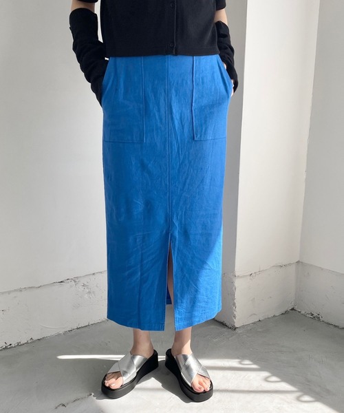 ■素材特性■リネンとレーヨンをブレンドした糸を使用して、柔らかく落ち感のある風合いに仕上げています。ストレッチ入りで伸縮性もあり穿きやすい素材になります。■デザイン■ストレッチの効いた涼し気な麻混素材&後ろゴム仕様なので、リラックスして着用いただけます。ハイウエスト&タイトなシルエットなので、スタイルUP効果も期待できます。今年らしいベイカーポケットディテールが、ポイントでシンプルな着こなしでも映えるタイトスカートです。■スタイリング例■シンプルなタイトスカートですが、フロント部分にベイカーデザインを施しているので、シンプルなTシャツやシアーシャツなどでも、今年らしく着用していただけます。鮮やかなカラーもスタイリングのポイントになります。