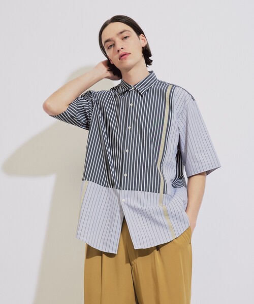 一枚で様になる遊び心あるデザインシャツ。 【素材】 柔らかいタッチが魅力のコットンを使用。 程よいハリ感がありつつも美しいドレープ感が特徴の素材です。 ※こちらの商品はやや透け感があるため、インナーの着用をおすすめします。 【デザイン】 2種類のストライプを使用しデザインしたストライプシャツ。 上部下部で仕様が違い一枚で様になるデザインです。 フロント左右にはラインのテープを配し深みの出る印象に仕上げました。 遊び心ある印象なのですが上品に洗礼されたデザインで非常に汎用性が高く重宝する一着です。 【スタイリング】 幅広いアイテムと相性が◎ スラックスなどと合わせるとクリーンでキレイ目な印象に。 デニムパンツにも相性が良く今年らしい雰囲気も演出できます。 こちらの商品は主に夏に着用いただける商品です。 モデル情報:身長175cm B83 W66 H87 着用サイズ:03(L) 店舗へのお問い合わせ商品番号:170-86314 ●製品寸法: 01(S):着丈72cm B120cm 袖丈16cm 肩幅51cm 02(M):着丈74cm B124cm 袖丈17cm 肩幅53cm 03(L):着丈76cm B128cm 袖丈18cm 肩幅54cm 備考: