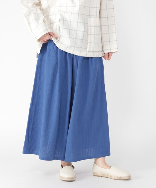 ーーー ドビーの表面感が特徴的な麻混素材を使用したタックスカーチョ。 スカートのようなシルエットは、足さばきもしやすく動きやすいデザイン。 ウエストはゴム+紐の仕様なのでサイズ調整も可能で着心地も◎ ゆったりとしたワイドシルエットなのにヒップ回りはスッキリ見え、 身体のラインを拾わないのが嬉しいポイントです。 ーーー 長すぎない丈感なので足元はスニーカーやサンダルと合わせても◎ また、同じシリーズのベストと合わせたセットアップ風の着こなしがおススメです。