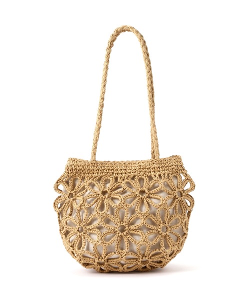 春夏に一つは持っていたいアイテム!フラワーモチーフが愛らしいデザインの雑材バッグ。コロンとしたコンパクトなフォルムながらしっかりと収納力があります。馴染みのいいベージュと落ち着いたライトグリーンの2色展開は、どちらもコーディネートを選ばずに活躍できます。※モデルの着用画像の場合、光の当たり具合により、実際の色味と異なって見えることがございます。