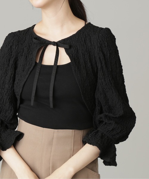 表面感のあるふくれジャガードを使用したショート丈のボレロ。膨れジャガードの立体感とボリュームスリーブがマッチして可愛らしい印象に。伸縮性もあり、ストレスフリーな羽織り心地です。ワンピースの上に羽織ったり、あえてカジュアルなアイテムと合わせてもバランスよく着られます。旬なショート丈は、普段のコーディネートのプラスワンアイテムとしてオススメ。●商品特性●〇透け感:なし〇生地の厚さ:普通〇裏地:なし〇伸縮性:あり〇光沢:なし〇シルエット:スモール------------------------------------------------------商品のお気に入り登録➡ お気に入りアイテムの値下げ・再入荷・在庫1点などの通知を受け取ることができます。ブランドのお気に入り登録➡ 新商品や再入荷、セール、クーポン配布などお得な情報を受け取ることができます。※商品の色味は、撮影場所や光のあたり具合などにより色味が違って見える場合が御座います。------------------------------------------------------
