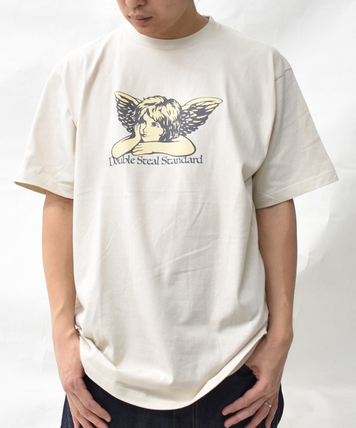 頬杖をついた天使が上品な雰囲気を演出。 シックな色使いで大人の着こなしが楽しめます。 丈夫で伸びにくいしっかりとした厚みのある生地。 左右両肩から首後ろまでテープ処理をしてあることで型崩れを防ぐ仕様になっている。