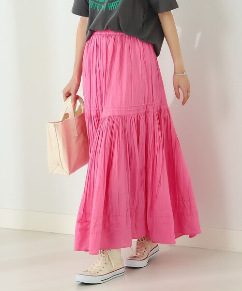 たっぷりとしたボリューム感が女性らしい◆お気に入り登録のおすすめ◆気になる商品には「お気に入り」登録がおすすめです!登録していただくと再入荷のお知らせやセール通知など、商品の最新情報が届きます。またマイページでいつでも確認が可能になります。お得な情報が届くこともありますので、是非ご活用ください。■デザイン分量たっぷりのシルエットがポイントのスカート。ピンタックデザインを取り入れ、レディライクな印象に導いてくれます。■コーディネートシンプルなTシャツやノースリーブトップスなどを合わせてスカートをメインにしたスタイリングもおすすめです。■サイズウエストゴムで快適な穿き心地です。■素材柔らかさのあるコットンボイル素材を使用。生地の厚さ:普通透け感:ややあり伸縮性:なし光沢感:なし裏地:あり【スタッフレビュー】スタッフ:袖山奈千可身長:158cm / 普段サイズ:M / 着用サイズ:Mサイズ感: ウエストゴムでストレスフリーなサイズ感。丈は甲にかかる長めの着丈です。素材感:インドコットンを使用しており清涼感のある柔らかい素材。ポイント: たっぷりと生地が使われており高見えするスカートです。※光の当たり具合やパソコンなどの閲覧環境によって、実際の色味と異なって見える場合がございます。予めご了承ください。※商品の色味は商品単体で撮影した画像をご参照ください。