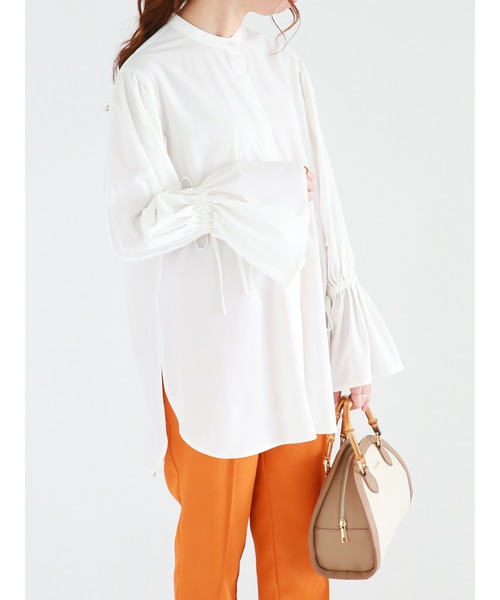 キャンディースリーブがスタイリングに華やかな印象を漂わせるブラウス。袖にはリボンをあしらい、フェミニンなムードをプラスします。バンドカラーのネックデザインが、首元をすっきりと見せてくれるのもポイント◎タイトめなスカートと合わせたメリハリのある着こなしがおすすめです。※商品画像は、撮影環境やお客様のご利用のPC・スマートフォンのモニター環境などにより実物と色味に差異がある場合がございます。【その他採寸】F 着丈:[前]76cm[後]80cm