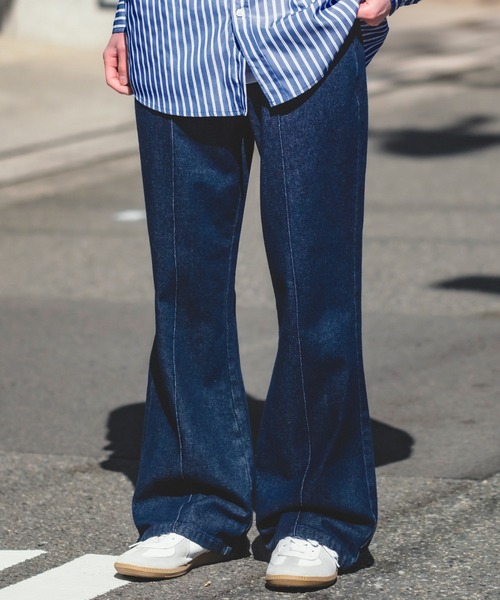 どこか上品なたたずまいが魅力のフレアカットジーンズをご紹介。●しっかりと手持ち感のあるコットンを混紡したデニム生地を採用●裾に向かって広がったフレアカットがきれいめコーデにもオススメ●ブルー、インディゴに加えケミカル、ストーンウォッシュをセレクト●ピンタックを施しセンタープレスをかけたような上品なシルエットにきれいめカジュアルから古着MIXや韓国ファッション、ヒッピースタイルにもオススメの一本。デニムパンツでありながらもスマートなシルエットでスラックスの代わりに外しアイテムとしても使えます。男性にはもちろん、メンズライクな女性にもはいていただきたい仕上がりになりました。