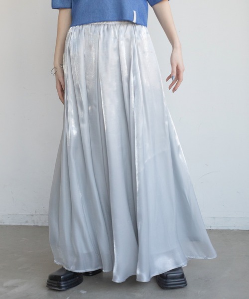 2024 VACANCY SUMMER COLLECTION 【再入荷】新色”SILVER”と”BLUE”を加えて再販スタート‼ ◆FABRIC シャイニー感のある生地で女性らしくMODEを楽しめるロングスカート。 ウエストゴムで楽ちんに着脱しやすく 艶感のあるシャイニー加工が華やかにしてくれるアイテム。 タックを多く付けることでランダムなシルエットになり 動くたびに様々な表情を見せてくれるスカートです◎ フレアシルエットながら落ち感のある生地が大人らしく さり気なく裾が透けることで涼しげな印象にしてくれます。 ※ウエストゴム部分を折り返すことで長さの調節が可能です。 ◆STYLE 定番で持っておきたいブラックに近いネイビーは、 カラーアイテムやモノトーンカラーでモードな印象に。 ブラウスと合わせるとキレイめスタイルになり、オケージョンとしてもオススメ。 爽やかなブルーは、コーディネートのポイントになり明るい印象に。 デニムシャツでワントーンコーデやトレーナーなどカジュアルアイテムとの相性も良くラフコーデにもオススメ! 上品なシルバーは、カラーアイテムやモノトーンカラーと合わせるだけで お洒落な印象にしてくれる今季注目のカラー◎ シアートップスやショート丈のトップスなどと合わせてトレンドライクなスタイルに。 ・・・・・・・・・・・・・・・・・・・・ 透け感:裾のみ 裏地:あり 伸縮性:あり 光沢感:あり 生地の厚さ:薄め ・・・・・・・・・・・・・・・・・・・・ 【お買い物をお楽しみいただく為に】 ▼お気に入り登録をオススメ致します▼ ♡をクリックして下さい。 ・《商品のお気に入り登録》で再入荷通知や、ラスト1点の通知、セールの際の通知も受け取ることができます。 ・《ブランドのお気に入り登録》で新作商品や再入荷など、お得な情報を受け取ることができます! 【ATTENTION】 ※画像の商品はサンプルです。 実際の商品と色味、仕様、加工、サイズ、素材等が若干異なる場合がございます。 ※撮影場所やお使いのモニター環境により若干お色味が異なる場合がございます。 ※製品によっては染料の特性上、湿った状態や汗をかいた状態での長時間の放置、または摩擦により、他のものへ色移りする恐れがありますので、着用時にはご注意下さい。 ※お洗濯については商品の洗濯タグ表記をご確認ください。 ※風通しがよく、湿気の少ない日の当たらない場所で保管して下さい。 ※また製品加工上、お手元に届く際に匂いが生じる場合がありますが、 ご使用を続けていく事により匂いは軽減されます。