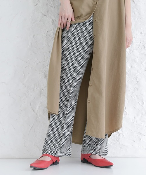 『ラクして美脚見せ。』コーデを華やかにする、着映え柄フレアパンツ♪カラー毎にテイストが異なるこだわりの柄がコーデのアクセントにぴったり。脚長効果抜群のフレアシルエットに、センターピンタックでさらにスタイルアップ。穿き心地の良い、伸縮性のあるカットソージャカード生地を使用。インナーが透けない程よい厚みでロングシーズンお洒落に活躍します。今、好きな物、興味あることを自由な発想で表現できる≪ n'OrLABEL ≫。「実用性と機能性、そして遊び感覚」、多面性を楽しめるピュアでモードなデザインライン。こなれた雰囲気溢れるお洒落大人女子になれる≪n'OrLABEL≫カットソージャカードフレアパンツです。