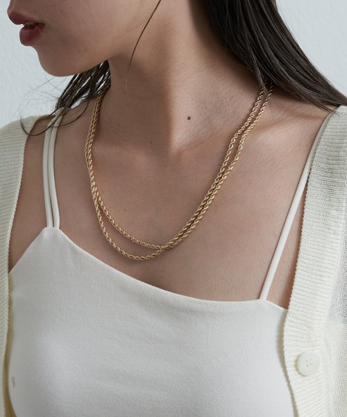 【ロープチェーンが輝く2連チェーンネックレス】 大流行中のロープチェーン2連仕様です、 ロープのように編み込まれた形状と表面のカット加工がキラキラと輝きます。 男性にも女性にも好まれるデザインなのでユニセックスにお使いいただけます。 【商品ポイント】 ・人気の2連仕様 ・ロープライクな表面感でキラキラ輝く ・シンプルなので重ね付けにもピッタリ ---------------------------------------------------- ■素材 本体:真鍮, 合金 ---------------------------------------------------- ※着用、お取り扱いの際は、商品についている品質表示とアテンションタグを必ずご確認下さい。 ※商品タグに記載されている商品名がWEBでの表記名と異なる場合があります。 ※画像の商品はサンプルです。実際の商品と仕様、加工、サイズが若干異なる場合がございます。 ※照明の関係により、実際よりもやや明るく見える場合がございます。またパソコンなどの環境により、若干製品と画像のカラーが異なる場合もございます。予めご了承くださいませ。 【お気に入り登録】してお得な情報をCHECK!! ・「商品のお気に入り登録」で再入荷通知や、ラストの通知、セール通知も受け取ることができます。 ・「ブランドのお気に入り登録」で新商品や再入荷など、お得な情報を受け取ることができます。