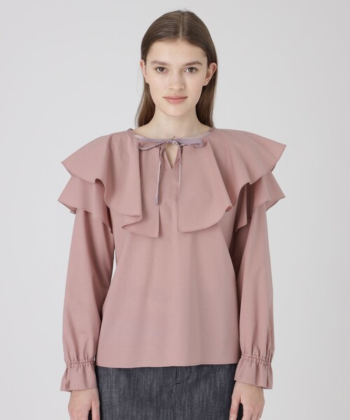 ◆ボリュームのあるラッフルがポイントの華やかブラウス 【Design】 天然由来の染料を使用した素材のブラウスです。 襟元から袖にかけてあしらったボリュームのあるラッフルが華やかな1枚。 前後着用が可能なので、気分やボトムとの合わせによってデザインの変化を楽しんでいただけます。 【Fabric】 果実や野菜の不使用部分等から抽出した天然由来の染料と、GOTS認証の環境に優しい化学染料を融合した染料で染めた素材です。 ピンク(12)はザクロ、ネイビー(29)はログウッド、ライトベージュ(40)はカカオ から抽出した自然染料を使用しています。 防シワ加工を施しているため、薄い生地でありながらシワになりずらい素材です。