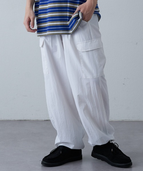 【カジュアルにもキレイめにも合わせやすいワイドカーゴパンツ】 シワが気になりにくいワッシャー加工を施し、軽やかな風合いの生地を使用しています。 カーゴパンツといえばしっかりした生地感が特徴ですが、ナイロンにすることで風通しもよく盛夏でも快適に履いていただけます。 トレンドライクなカーゴパンツをワイドシルエットにすることでルーズな着こなしが可能になっております。 カーゴパンツならではのサイドポケットと裾のドローコードを採用しつつ、微光沢のある生地でコーデに取り入れるだけで主役のアイテムになります。 裾のドローコードの調節次第で2WAYで穿いていただけます。 【商品ポイント】 ・裾はドローコードで調節可能 ・シワが目立ちにくいワッシャー加工 ・微光沢がカジュアルすぎずキレイめな印象に ・ワイドシルエットながらも軽く通気性もよい ・ウエストゴムと紐で裾にはドローコード付きで、サイズ調整もしやすく女性にもオススメ ---------------------------------------------------- ■商品特徴 洗濯方法:洗濯機洗い可(弱) 裏地:なし 透け感:ややあり(ホワイトのみ) 伸縮性:なし 光沢感:ややあり 生地の厚さ:普通 ---------------------------------------------------- ■素材 ナイロン100% ---------------------------------------------------- ※着用、お取り扱いの際は、商品についている品質表示とアテンションタグを必ずご確認下さい。 ※商品タグに記載されている商品名がWEBでの表記名と異なる場合があります。 ※実際の商品と仕様、加工、サイズが若干異なる場合がございます。 ※照明の関係により、実際よりもやや明るく見える場合がございます。 またパソコンなどの環境により、若干製品と画像のカラーが異なる場合もございます。予めご了承くださいませ。 【お気に入り登録】してお得な情報をCHECK!! ・「商品のお気に入り登録」で再入荷通知や、ラストの通知、セール通知も受け取ることができます。 ・「ブランドのお気に入り登録」で新商品や再入荷など、お得な情報を受け取ることができます。