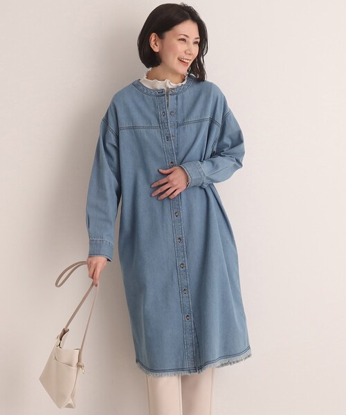【デザイン】 バンドカラーでトレンド感のあるシャツワンピース。 ゆったりとした着心地で、リラックス感もあり、普段使いも◎ シンプルなデザインなので、どんなスタイルにも好相性です。 裾のフリンジもポイント! ※ポケット数:横×2 【スタイリング】 デニムアイテムは今期のトレンド。 コーデの主役になあるワンピースで取り入れれば今年らしさをプラスできます! 顔まわりをスッキリ見せてくれるノーカラーデザインで、シンプルないつものコーデにさっと羽織るだけで一気にスタイルUP。 前をしめてワンピースとして着用する際にはシアーインナー等をレイヤードしたり、カーディガンを羽織ると◎ 【素材】 ゴワツキや厚みは控え目、一枚でも羽織でもさらりと着れるデニム生地。 アタリ感のある本格加工も施されています。 ※裏地なし モデル情報:身長167cm B78 W62 H88 着用サイズ:02(M) 店舗へのお問い合わせ商品番号:C62-56008 ●製品寸法: 02(M):着丈105cm B110cm 袖丈49cm 肩幅53cm 03(L):着丈107cm B113cm 袖丈50cm 肩幅54cm 04(LL):着丈109cm B116cm 袖丈51cm 肩幅55cm 備考: