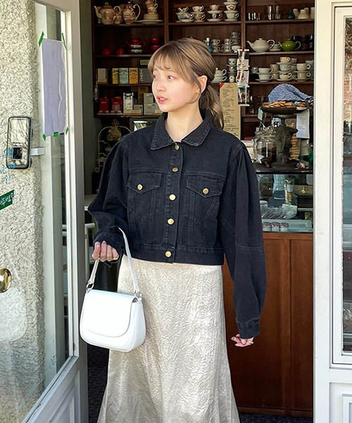 パフスリーブデザインが可愛いデニムジャケット ゆとりのあるパフデザインが体系カバーを叶えてくれるアイテムです◎ ショート丈なのでワンピースやハイウエストボトムスとの相性も抜群で、 スタイルアップ効果も期待できます? 着用カラー:ブラック