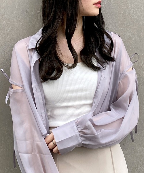 2023 SS 春夏アイテム クロはWEB限定カラーです♥ 【トレンドの肩スリットシャツをショート丈にアップデート!】 ▼Design ・ラメを散りばめた生地が華やかな印象を与える短丈シアーシャツ。 ・今季も継続して人気の肌見せディテールが、カジュアルなシャツに女性らしさをMIX。 ・袖に入ったスリットは、リボンで調節可能です。 ・ふんわりとしたボリュームスリーブとショート丈のバランスが、スタイルをすっきりと見せます。 ・カジュアルデザインに柔らかい雰囲気を与える、春夏らしいカラー展開。 ▼Styling ・トップスとしても羽織としても着こなせる万能アイテム◎ ・こなれ感あるディテールで、デニムと合わせてもメンズライクになりすぎません。 ・ロングスカートで大人カジュアルに着こなせます。 ・ミニボトムと合わせて韓国っぽく。足元はスニーカーや厚底靴などが好バランス。 ・シアー感や肌見せをより効果的に魅せるために、インナーはキャミソールやタンクトップがおすすめです◎ ▼Fabric ・ポリエステル100%使用しているのでシワになりにくく、型崩れもしにくいです。 ・さらりとした肌触りで着心地も快適。 ・UV・紫外線対策にもおすすめ◎ ----------------------------------------- 【以下ピンク参考。カラーにより多少の誤差あり】 ・透け感:透ける ・伸縮性:なし ・生地の厚さ:薄い ・裏地:なし ----------------------------------------- 【スタッフ着用コメント】 身長165cm 透明感のあるシアーシャツに肩スリットでトレンドをプラスしたアイテム。 トップスとボトムの境目程の丈感で、腰から足先にかけてすらっと長く見せてくれます。 ゆったりとしたサイズ感なのでタイトボトムともちろん相性がいいですが、 ショート丈のおかげでゆったりとしたカーゴパンツやロングスカートでもバランスを取りやすい優れものです!
