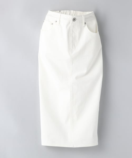 ☆着回し力抜群のスカート♪☆春のトレンドのデニムタイトスカートです。丈はまだまだ人気のミモレ丈♪後ろにスリットが入っているので歩きやすく、ストレッチの効いた生地とウエストのゴム仕様がとっても穿きやすいです♪ホワイトカラーも今季はキーカラー♪インディゴもホワイトもワントーンコーデにもオススメです。ブラウス合わせできれいめコーデ、Tシャツ合わせでカジュアルコーデと幅広くお使い頂けます☆