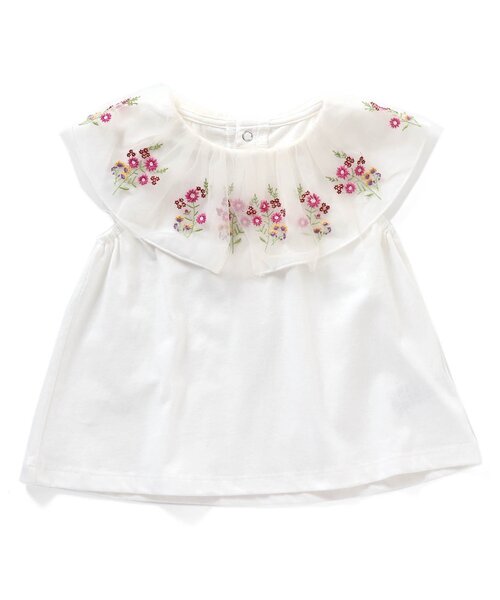 Seraph(セラフ)の半袖Tシャツ「チュール刺繍トップス」は、シンプルなテキスタイルと優しい色使いでナチュラルテイストのおしゃれにおすすめです!
