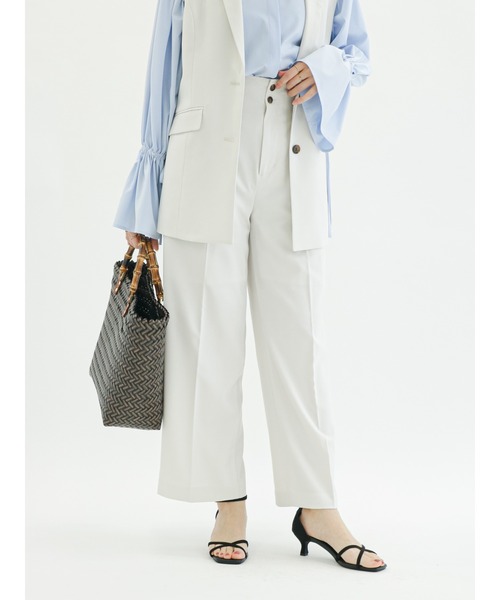 縦に並んだウエストボタンがクラシカルな風合いを演出するパンツ。 センタープレスを施し、すらっとした縦のラインを描きます。 トップスの裾をインしたメリハリのあるコーディネートがおすすめ◎ 麻を使用したようなさらっとした着心地が魅力のアイテムです。 ※商品画像は、撮影環境やお客様のご利用のPC・スマートフォンのモニター環境などにより実物と色味に差異がある場合がございます。 【その他採寸】 S ウエスト:[後ゴム仕様]62cm M ウエスト:[後ゴム仕様]66cm