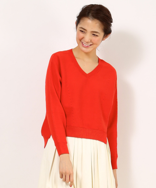 シンプルなVネックニットプルオーバー。シンプルながら袖がドルマンになっていて、裾もスリットをいれるなど細かいおしゃれさのある1枚。丈感もパンツ、スカートどちらにでもあわせやすいデザイン。1枚でも透けにくい程度の薄さで春ニットにおすすめです。