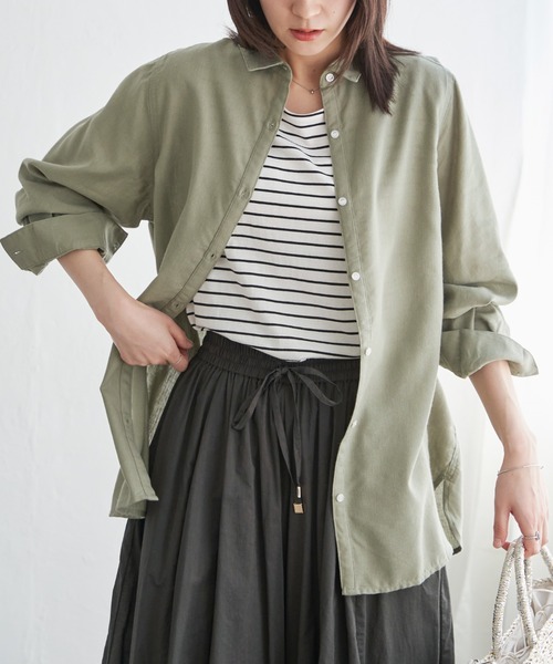リネン混素材のベーシックな長袖シャツ。チュニック感覚で着られるよう着丈を長めにすることで、さまざまなアレンジが可能です。【素材】上質なリネンを使用しており、さらにレーヨンをブレンドしたやわらかくなめらかな風合いの生地です。【デザイン】一枚着でも羽織りでも使える着丈感。王道のレギュラーカラータイプのシャツです。【ikkaポイント】リネン混素材にさらにやわらかさを与え、使い込むほどに味が出る素材感にアップグレードしました。衿は小さめのフォルム・細めの前立て・後ろタックのボリューム感が女性らしい繊細なシャツに仕上げています。【おすすめコーディネート】長めの着丈でチュニック風に着こなせるため、一枚で着ても今年らしさがあります。スキニーパンツやテーパードパンツに合わせてかっちり着たり、スカートにINしてトレンド感を楽しんだり、リラックスなワイドパンツに合わせてご近所コーデと、マルチに活躍する万能アイテム!■スタッフ着用コメント・159cm/サイズM柔らかい肌触りが特徴のリネン混シャツは適度なゆとりがあり、今年らしいベーシックスタイルとして幅広く着られます!衿を後ろに抜き、袖を2~3回ほどラフに折りあげ、ざっくり羽織るようなスタイリングもおススメ!カラーによって雰囲気が変わるのも魅力的なポイントです♪夏場は冷房対策としても使えるので重宝間違いなしな一押しアイテムです![クリーニング]洗濯機洗い可、ドライクリーニング可(F)、ウェットクリーニング(W)