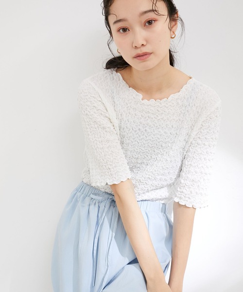 柔らかくて着心地がよく、着回し抜群のカットソー【デザイン・シルエット】 立体感あるふくれジャガード素材を使用したカットソーです。 <POINT> ・ネック部分を開きすぎず、詰まりすぎず、程よい抜け感が出るような高さにしています。 ・伸縮性ある素材感なので、締め付け感無く快適に着用いただけます。 ・シンプルなデザインで着回しやすく、素材の凹凸感がアクセントにもなります。 【素材】 さらりとした綿メインの伸縮性のある素材感。 【カラー】 着回ししやすいベーシックカラーと、爽やかなサックスカラーの3色展開です。 サックスのみ、メロー始末を配色カラーにして遊びを入れています。 【おすすめのスタイリング】 1枚着としてはもちろん、キャミワンピ・ジャンスカ・オールインワン等とのレイヤードスタイルにも合わせるのもおすすめです◎ ----------------------------- 裏地:なし 光沢感:なし 透け感:ホワイト若干あり 伸縮性:あり 生地の厚さ:普通 季節:春、夏、初秋 ----------------------------- 【モデル着用サイズ】 全色モデル身長:166cm、着用サイズ:F ブラック・ホワイト着用モデル身長:161cm、着用サイズ:F ※画像の商品はサンプルです。 実際の商品と仕様、加工、サイズが若干異なる場合がございます。