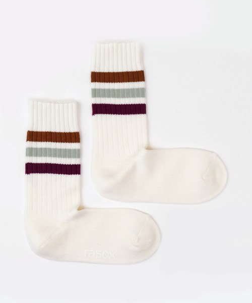 rasox(ラソックス)は「直角を基本に運動」する足の形を考えて直立時のカタチに合わせて編み込んだL字型一体成形編み靴下です。従来の靴下のように足裏面を引っ張ることなく 甲の弛みや踵の引き伸ばしを解消し、靴下全体からやさしく包み込まれるようなソフトなフィット感得られます。ヴィヴィッドなカラーが目を引く3ラインのクルーソックス。履き口はソフトな肌触りのシングル・トップ仕上げ、リブ部分は疑似的な仕様です。吸汗速乾性に優れた糸を使用し、中肉厚に編み立てている為、シーズンを問わず着用可能です。SIZE S (22~24cm)SIZE M (24~26cm)SIZE L (26~28cm)