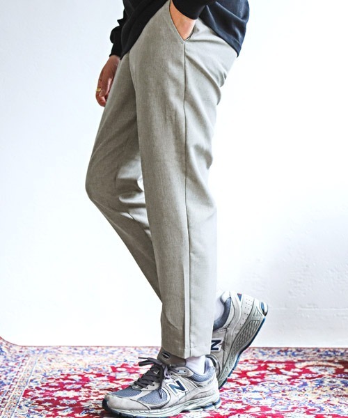 リネンのようなナチュラルな風合いの速乾素材を採用したトラウザーパンツ。 軽やかな穿き心地に加えて、全体的にゆとりを持たせたシルエットで楽な穿き心地を実現。 ウエストはイージーパンツ仕様ながらそれを感じさせない大人の上品でクリーンな印象を与えてくれます。 裾に向かって細くなるテーパード仕様にセンタープレスを落とし込んだこだわりのシルエットです。 Tシャツと合わせてカジュアルにも、ジャケットを羽織ってキレイめスタイルにも使える魅力のアイテムをぜひ。