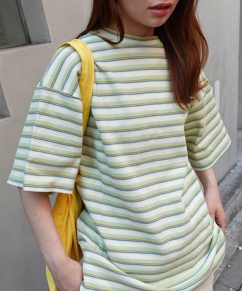 レトロなマルチカラーでのワッフル生地で、ざっくりとした風合いが魅力のボーダーTシャツ ネックラインは広すぎず、詰まりすぎずでちょうどいいライン 二の腕もカバーしやすい袖丈が嬉しいポイント 今季人気のマルチボーダーでユニセックスに楽しめるカットソーアイテムです シンプルなコーディネートのアクセント使いにも最適! ゆったりとした身幅など、1枚でもサマになる着映え感バッチリなオーバーサイズシルエットで仕上げた1着です。 1枚での着用としてはもちろん、ジャンスカのインナーやウエストをタックインさせたスタイルなど、ルーズなデニムをはじめ、ワイドなスラックス、コットンスカートなど、様々なボトムスとの相性も抜群です。 ▽生地感 透け感:あり 〇〇〇〇● なし 生地の厚さ:厚い 〇●〇〇〇 薄い 裏地:なし 伸縮性:あり ◆商品のお気に入り登録 【お気に入りに登録】を是非ご活用ください。 再入荷の通知や、ラスト1点の通知、セールの通知がいち早く届きます。 ◆ブランドのお気に入り登録 新商品や再入荷など、いち早くブランドのお得情報が届きます。 ◆ATTENTION◆ ※取り扱いについては、商品についている品質表示でご確認ください。 ※出来る限り忠実に再現するよう務めておりますが、 ディスプレイ画面などの環境上、店頭・屋外での撮影画像は、 光の当たり具合で色味が違って見える場合が あります。ご了承下さい。 ※こちらの商品は水や雨に濡れたり、汗による湿気、乾燥状態での摩擦により、薄い色の衣服などに 色移りする可能性がございます。 予めご了承いただき、ご使用の際にはご注意くださいますようお願い致します。 ※平置きでの実寸のため若干の誤差が生じる場合がございます。 ※生産時期により若干の色ブレやサイズの変動が生じる場合がございます。 ※また製品加工上、お手元に届く際に匂いが生じる場合がありますが、 ご使用を続けていく事により匂いは軽減されます。 ※輸送時による、多少の汚れ・シワがある場合がございます。