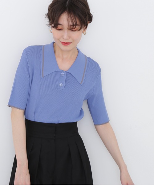 襟と袖口にバイカラーラインを効かせたポロ襟リブニット。浅めのVネックにポロ襟をあわせて、シーズンライクな表情に見せてくれます。身頃はすっきりとしたシンプルなシルエットなので、ボトムスにINするとバランス良く決まります。ボリューム感のあるスカートやワイドパンツ、Iラインスカートやデニムパンツなど、幅広いコーディネートが楽しめます。【Designer's Voice】配色のラインがポイント。Vネック風なデコルテのデザインで女性らしいポロニットに仕上がりました。ボタンは半開になります。**********************透け感:なし裏地:なし伸縮性:ややあり光沢感:なし生地の厚さ:普通**********************【スタッフ着用コメント】身長:158cm/体型:普通/普段サイズ:M/着用サイズ:M 【素材感、着心地】 柔らかなニット素材で伸縮性もあり着心地◎ ポロ襟で首元も開きすぎず、カラダにフィットするので前かがみしても胸元の開き具合は気にならないです。 【サイズ感】 Mワンサイズ。身頃や腕周りはスッキリしており細見えします♪長すぎない丈感なのでアウトスタイルでも◎