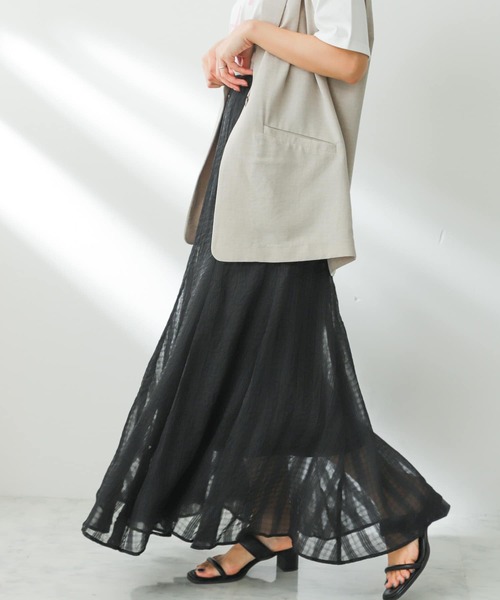 歩くたびに華やかに揺れ動くマーメイドラインのスカート 〇裾に向かってフレアがかかったスッキリ見えするシルエットに仕上げました 〇凹凸感のあるシアーチェック柄 〇後ろゴム仕様でストレスフリーな履き心地 styling シアーのチェック柄生地が涼しげなシーズンムードたっぷりなスカートは、リブニットとすっきり合わせたり、ロゴTでラフに着こなしたり。きれいめからカジュアルまで、幅広い着こなしに使える1枚です。 material ポコポコとしたさりげないチェック柄が可愛いシアー素材 ※この商品は、素材の特性上、激しい動きで強い力がかかったり、他のものに引っ掛かったりすると、滑脱(縫い目が滑って開いたり、縫いしろが抜ける)したり、目寄れ(織り糸が滑って片寄り、織り目が開く)が生じる場合があります。ご使用の際には十分ご注意ください。 ※商品画像は、光の当たり具合やパソコンなどの閲覧環境により、実際の色味と異なって見える場合がございます。予めご了承ください。 ※商品の色味の目安は、商品単体の画像をご参照ください。 ▼お気に入り登録のおすすめ▼ お気に入り登録商品は、マイページにて現在の価格情報や在庫状況の確認が可能です。 お買い物リストの管理に是非ご利用下さい。 ----------------------------- 透け感:なし 伸縮性:なし 裏地:あり 光沢:ややあり ポケット:なし -----------------------------