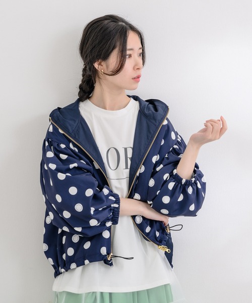 【KATAHRINE ROSSセレクト】 margaux/マルゴー margauxオリジナルのドットが印象的。 キャッチーな見た目のフード付きブルゾン。 [素材] ・さらりと着れるポリエステル素材。裏地付きです。 ・袖や裾のバルーンシルエットがキレイに表現できる薄手素材です。 [デザイン] ・オリジナルのロゴ入りドットが印象的。 ・袖のボリュームスリーブは着るだけで旬な雰囲気に。 ・裾はお好みでドロストしてバルーンシルエットを楽しめます。 ・フード付きでカジュアル感あるデザイン。 [スタイリング] ・シアー素材のインナーを合わせて旬なイメージに。 ・ネイビーカラーのブルゾンを引き立てるカラーボトム合わせもおすすめ。