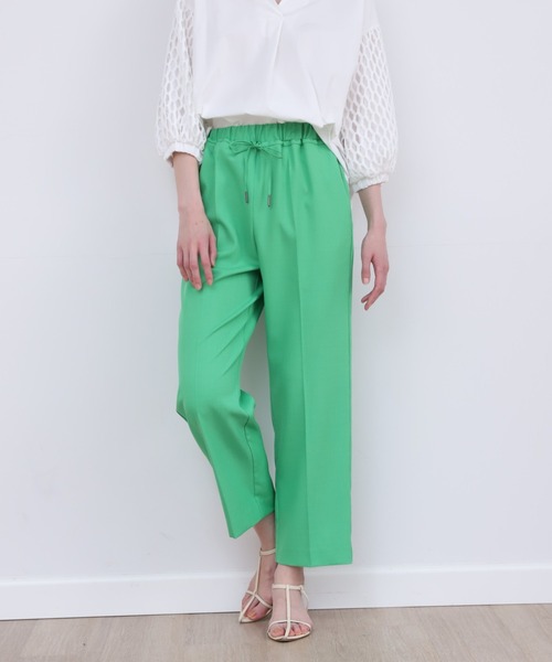 ストレッチ性のあるポリエステル素材を使用したストレートシルエットパンツ。ウエストゴム&ドロストのイージーパンツ仕様でストレスなく穿いて頂けます。シンプルになりがちなスタイリングにアクセントをプラスするカラーも魅力です。 透け感:なし 伸縮性:あり 裏地:なし 光沢:なし ポケット:ありウエスト:総ゴム仕様洗濯方法:水洗い可■サンプル撮影商品■こちらの商品はサンプルでの撮影となっております。実際の商品とは、サイズや色味、素材、デザイン等の仕様が若干変更になる場合がございます。