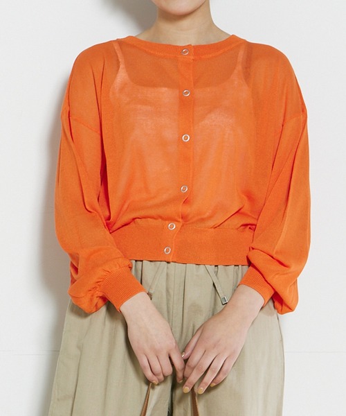 シアーの透け感と、スナップボタンが特徴的なカーディガン。薄手で軽くさっと羽織れ、持ち運びに便利な1枚。スタイリングのバランスがとりやすい丈感で、パンツでもスカートでも合わせやすい優秀なアイテム。クルーネックの前後2WAYなのでどんなトップスとも相性が良く、着回し力抜群です。***************伸縮性:有り透け感:有り生地の厚さ:薄い***************レビューSTAFF.A・M(年齢:40代/身長:170cm/骨格タイプ:ナチュラル/着用サイズ:フリー)■生地感滑らかでザラザラしません。■サイズ感全てボタンを閉めてもゆとりがあります。スカート、パンツ共に相性の良い着丈です。■サンプル撮影商品■こちらの商品はサンプルでの撮影となっております。実際の商品とは、サイズや色味、素材、デザイン等の仕様が若干変更になる場合がございます。