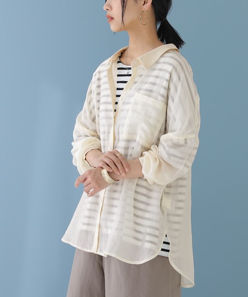 折り紙のように畳んだバックタックがポイントのデザインシャツ。前身頃はシンプルだから使いやすく、ヘビロテしやすい一着。のっぺりと見せないように胸ポケット付きのデザインです。上品な透け感で、さらりと軽やかな風合いのシアー生地を使用。シワ加工を施しているので、着るだけでこなれ感をプラスしてくれます。バックデザインで魅せる≪n'OrLABEL≫後ろタックシンプルシアーシャツです。こちらの商品は、 モノフィラメント糸を使用しております為、お肌に刺激を感じる場合がございます。敏感肌の方は、インナーを合わせてご着用くださいませ。 ご了承の上ご購入いただきますようお願いいたします。