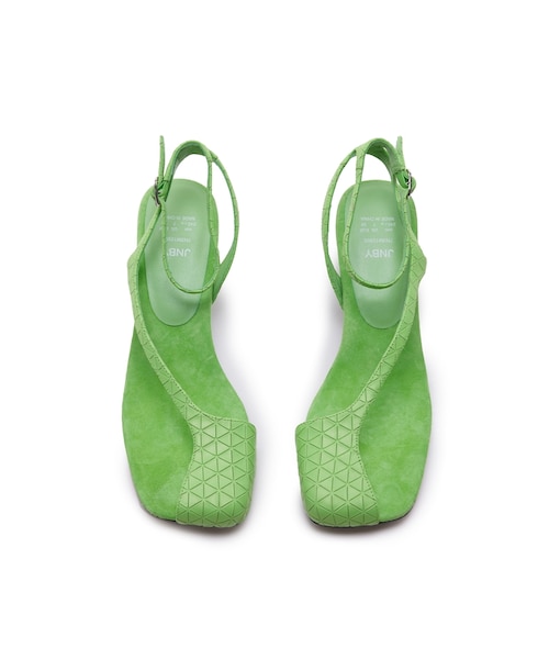 【DESCRIPTION】 個性的なデザインが光る親指カバーのトングヒールサンダル。三角形のエンボス加工が特徴的。足首のストラップでしっかり固定し、ソールのふわふわ感も気持ち良い。目を引くデザインと履き心地が魅力な1足。 【MATERIAL】 [甲材 材料の種類]牛革 [底材]合成底