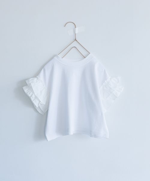 ◇デザイン 袖は布帛、身頃はカットソーを使用した、異素材コンビのデザイントップス。 袖のフリルにボリュームをつけ、 いつもより着丈を短丈に設定し、女の子らしく仕上げました。 ちょっぴりしっとりとしたナチュラル感のあるカラー並びもポイントです! ◇スタイリング コットンタックショートパンツなど ナチュラル感のあるボトムとの合わせるのがおすすめ! もちろんデッキショーツやデニムショートパンツなど カジュアルなボトムと合わせて、 元気なカジュアルスタイルにも相性◎です!
