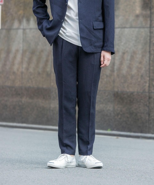 【大人の魅力を引き立てる清涼感パンツ】 清涼感あふれるスラックスはポリエステル糸でリネンを表現したサマーツイード素材を使用。ドライなタッチ感で適度なハリ感とと凹凸の表面感が特徴的で品のある大人らしい雰囲気を楽しめます。 カッチリしすぎない抜け感も備えていることでカジュアルコーディネートにも馴染みやすく汎用性も◎ ワンタック、テーパード美脚ラインのスマートなシルエットにドローコード付のイージー仕様で気軽かつ軽やかに仕上げています。 使いやすいソリッドなネイビー、ブラック2色のカラーバリエーションで大人の色気や魅力をこれぞとなく引き出してくれる一本です。 同素材の「サマーツイードテーパードパンツ(RA35-17M001)」とのセットアップスタイルもおすすめです。 -POINT- ・凹凸のある立体的なリネンのような素材感は清涼感溢れる雰囲気 ・サッと羽織れる軽快さは余裕のある大人感を ・テーパード美脚ラインのスマートシルエット ・かっちりしすぎない抜け感の絶妙なバランス ・ご自宅で洗濯が可能 -COORDINATE- ・ジャケパンスタイルのバリエーションとして単体使い◎ ・カットソーで抜け感のあるスタイルがおすすめ ・レザーシューズやレザーサンダルでより大人の感のある雰囲気に ※商品画像は、光の当たり具合やパソコンなどの閲覧環境により、実際の色味と異なって見える場合がございます。予めご了承ください。 ※商品の色味の目安は、商品単体の画像をご参照ください。 ▼お気に入り登録のおすすめ▼ お気に入り登録商品は、マイページにて現在の価格情報や在庫状況の確認が可能です。 お買い物リストの管理に是非ご利用下さい。 ----------------------------- 透け感:なし 伸縮性:なし 裏地:なし 光沢:なし ポケット:あり -----------------------------